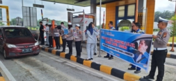 Kasubdit Regident Kompol Fatikh Dedi Setyawan bersama Kasat PJR Kompol Indra Lukman Prabowo dan perwakilan PT Hutama Karya serta PT Jasa Raharja melaksanakan kampanye di Gerbang Tol Pekanbaru - Dumai, Sabtu (5/10/2024).