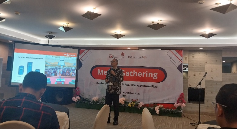 Kepala BEI Riau, Emon Sulaiman, memberikan paparan saat media gathering di Pekanbaru, Kamis, 9 Oktober 2025. (Linda)