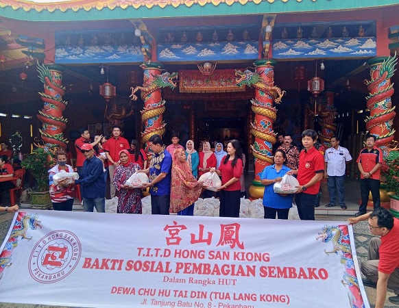 PEKANBARU - Tempat Ibadah Tri Dharma (TITD) Hong San Kiong Jalan Tanjung Batu, Pekanbaru bagikan sembako untuk masyarakat sekitar, Sabtu (15/11/2025). Sembako diserahkan secara simbolis oleh King Cu TITD Hong San Kiong, Armanto dan Ketua RW 04, Kelurahan Pesisir, Kecamatan Limapuluh, Wisman K.