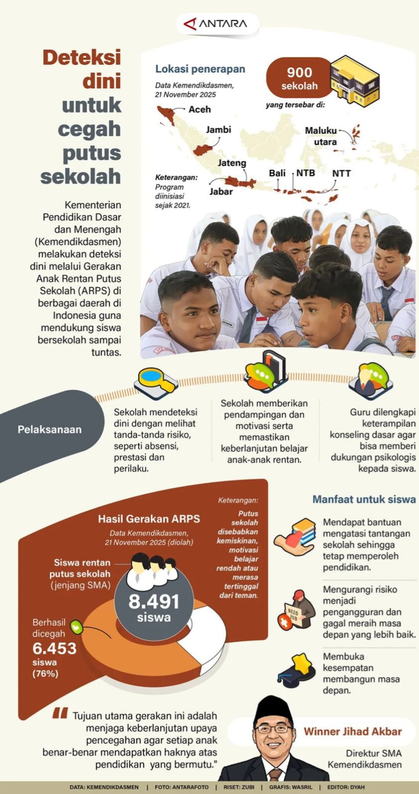 Kementerian Pendidikan Dasar dan Menengah (Kemendikdasmen) melakukan deteksi dini melalui Gerakan Anak Rentan Putus Sekolah (ARPS) di berbagai daerah di Indonesia guna mendukung siswa bersekolah sampai tuntas.(ant)