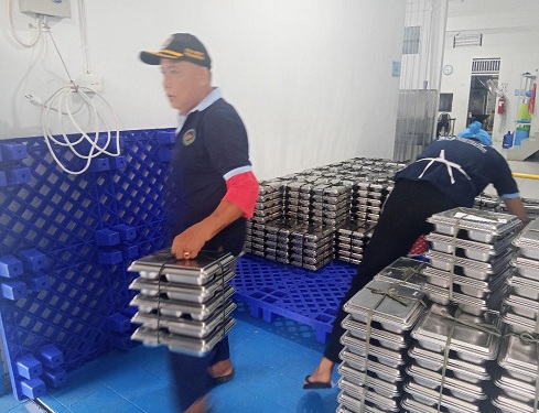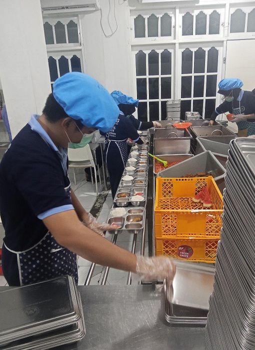 Bahan baku makanan setiap harinya datang pukul 15.00 WIB hingga 19.00 WIB. Untuk proses memasak dimulai jam 01.00 dini hari WIB. Para relawan menggunakan Alat Pelindung Diri (APD) lengkap. Mulai dari sandal hingga penutup kepala. Peralatan memasak dibersihkan sekali lagi untuk memastikan tidak terdapat debu yang menempel.