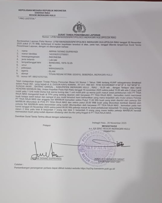Ia melaporkan dugaan tindakan brutal yang dilakukan oleh pria berinisial HM dan sejumlah rekannya, yang diduga membawa massa dari luar Kabupaten Indragiri Hulu untuk melakukan pencurian, perusakan, serta intimidasi terhadap karyawan dan manajemen PT TRM di areal perkebunan.