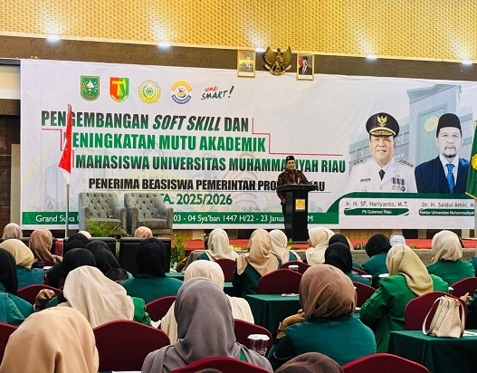 PEKANBARU - Sebanyak 345 mahasiswa Universitas Muhammadiyah Riau (Umri) mengikuti kegiatan pengembangan soft skill dan peningkatan mutu akademik TA 2026/2026, Kamis (22/1/26). Para peserta merupakan penerima beasiswa berprestasi dan tahfiz dari Pemerintah Provinsi (Pemprov) Riau.