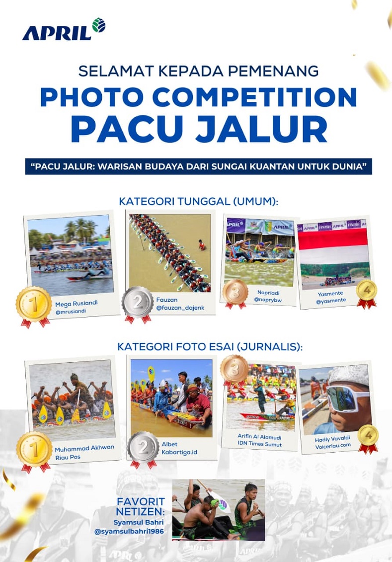 “Kami mengucapkan terima kasih kepada seluruh peserta yang telah mengabadikan setiap momen Festival Pacu Jalur dengan penuh kreativitas. Melalui pengumuman secara online, kami ingin memastikan semangat dan nilai-nilai kebersamaan dari pacu jalur bisa menjangkau audiens yang lebih luas, sekaligus menjadi sarana promosi pariwisata Riau,” ujarnya.